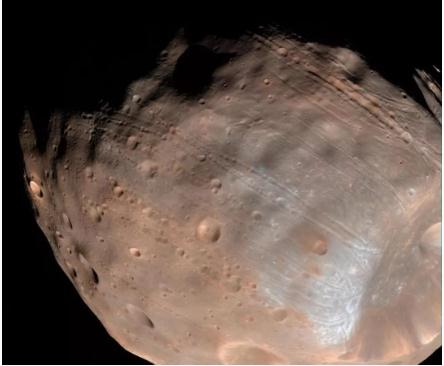 維京 1 號軌道衛(wèi)星于 1977 年拍攝了這張火衛(wèi)一的照片。斯蒂克尼隕石坑在左側(cè),同時可以看到水平延伸出去的神秘凹槽。