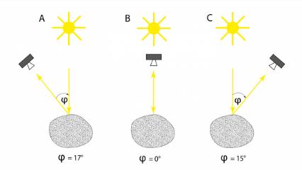 相角(在圖中標記為“φ”)是從目標對象本身(火衛(wèi)一)觀察到的光源(在這里為太陽)與觀察者(“火星快車”)之間的角度。在火衛(wèi)一的影片中,初始相位角為 17 度(圖A),在中途下降到幾乎零度(當火衛(wèi)一最亮?xí)r,圖B),然后在動畫結(jié)束時上升到 15 度(圖C)。