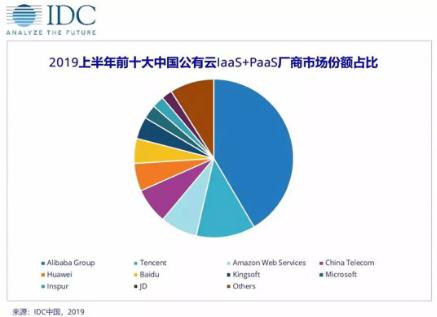 根據(jù)國際數(shù)據(jù)公司(IDC)11 月發(fā)布的《中國公有云服務(wù)市場(2019 上半年)跟蹤》報告,2019 上半年中國公有云服務(wù)整體市場規(guī)模(IaaS/PaaS/SaaS)達(dá) 54.2 億美元,綜合 IaaS+PaaS 的市場占有率位居行業(yè)第二梯隊,而阿里云的市占率接近 50%。