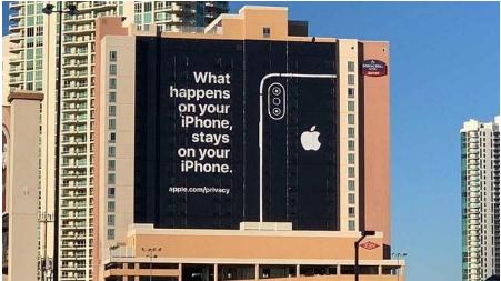 在CES現(xiàn)場附近的巨幅廣告上,蘋果這樣寫道:“what happens on your iPhone stays on your iPhone”(iPhone手機(jī)收集的信息,都只在手機(jī)上)。