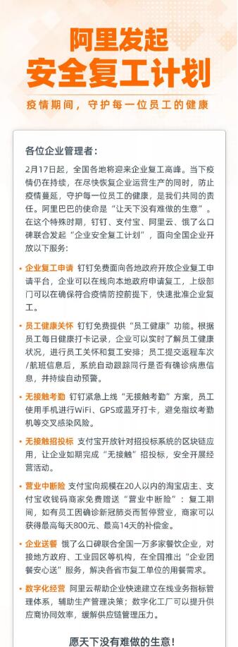 2月15日,阿里巴巴旗下釘釘、支付寶、阿里云、餓了么口碑聯(lián)合發(fā)起了一項(xiàng)企業(yè)安全復(fù)工計(jì)劃,包含復(fù)工申請、員工健康管理、無接觸辦公、企業(yè)送餐等7項(xiàng)服務(wù),以幫助企業(yè)安全有序復(fù)工。