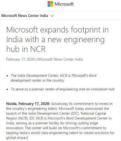 微軟已宣布將在印度建立一個(gè)新的工程中心,以進(jìn)一步兌現(xiàn)為印度工程人才而投資的承諾。作為一項(xiàng)互惠措施,其同樣有助于微軟在當(dāng)?shù)氐臉I(yè)務(wù)開拓與發(fā)展。據(jù)悉,該中心位于新德里郊區(qū)德里諾伊達(dá)(NCR),屬于微軟在印度設(shè)立的第三個(gè)開發(fā)中心。