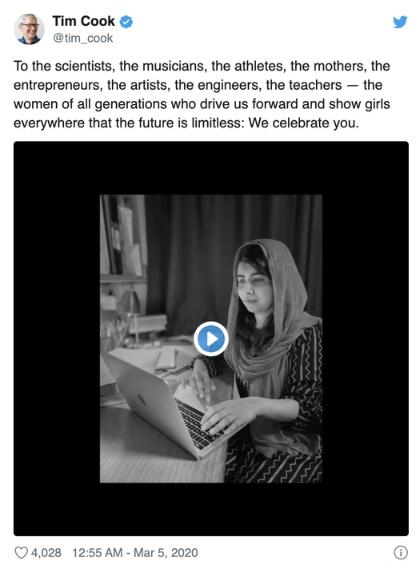 庫克的 Twitter 消息中包括了一段 40 秒長的視頻,其中包含了碧昂絲的歌曲《Flawless》,以及使用 MacBook 的女性形象。視頻中出現(xiàn)的其他女性還包括歌手 Lady Gaga、南非由女性運(yùn)營的反偷獵組織“黑曼巴”,以及巴基斯坦的社會(huì)活動(dòng)家馬拉拉·尤薩福扎伊(Malala Yousafzai)。