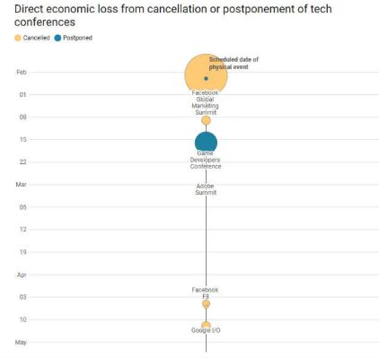 圖:因受疫情影響而推遲或被取消的科技盛會(huì)造成的經(jīng)濟(jì)損失不斷上升