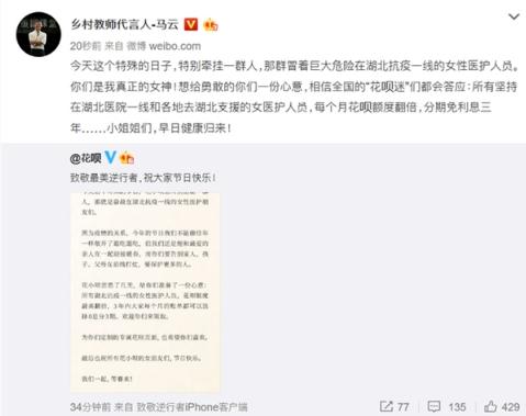 3 月 8 日消息,繼給援助湖北醫(yī)護人員送奶茶,炸雞、小龍蝦之后,今天馬云轉(zhuǎn)發(fā)微博,表示要給在湖北一線的女醫(yī)護群體花唄額度翻倍和 3 年分期免息。