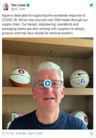 4 月 6 日消息,蘋果 CEO 蒂姆·庫克今日在社交網(wǎng)絡(luò)分享了一段視頻,介紹了蘋果公司對(duì)新冠病毒做出的最新舉措。