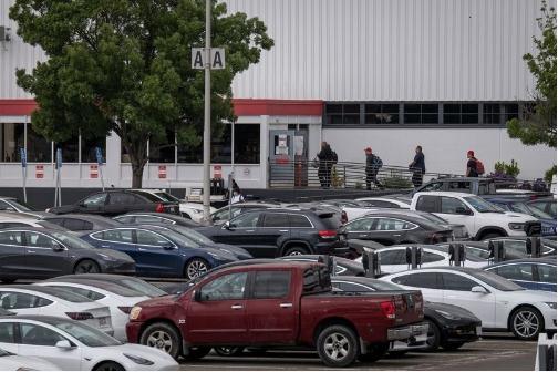 圖示:工人走進特斯拉弗里蒙特工廠