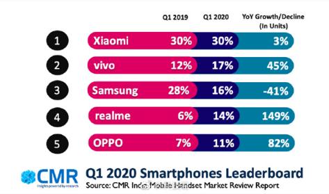 5 月 31 日,據(jù)媒體報道,CMR 發(fā)布 2020 年 Q1 印度智能手機品牌出貨量 TOP5,小米、vivo、realme、OPPO 榜上有名,三星屈居第三。