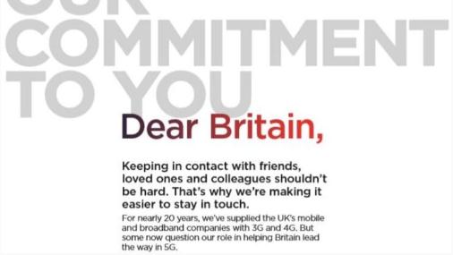 華為在《我們對(duì)你們的承諾》廣告中稱:“近 20 年來(lái),我們?yōu)橛?guó)的移動(dòng)和寬帶公司提供了 3G、4G 網(wǎng)絡(luò),但是一些人現(xiàn)在質(zhì)疑我們?cè)趲椭?guó)引領(lǐng) 5G 部署方面所扮演的角色。華為將繼續(xù)一如既往地為你們的網(wǎng)絡(luò)運(yùn)營(yíng)商提供最好的設(shè)備,這樣你們就可以分享照片、觀看流媒體電影。”