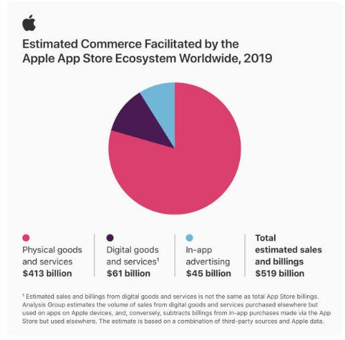 根據(jù)蘋果公布的數(shù)據(jù),在 2019 年 App Store 生態(tài)系統(tǒng)在全球促成 5190 億美元的款項(xiàng)和銷售額,根據(jù) Analysis Group 的數(shù)據(jù)表明,這些銷售包括了 175 個國家和地區(qū)。