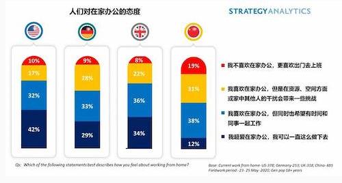 通過(guò)對(duì)美國(guó)、德國(guó)、英國(guó)和中國(guó)的 5000 多名消費(fèi)者進(jìn)行問(wèn)卷調(diào)查,Strategy Analytics 消費(fèi)者洞察團(tuán)隊(duì)發(fā)布了最新的免費(fèi)報(bào)告《疫情前后的在家辦公情況》。報(bào)告指出,疫情之后,許多員工已經(jīng)準(zhǔn)備好接受在家辦公。
