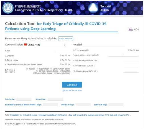 此項(xiàng)研究基于人工智能深度學(xué)習(xí)所建立的生存模型,對(duì) COVID-19 患者入院時(shí)的 10 項(xiàng)臨床特征進(jìn)行分析,可以幫助預(yù)測(cè)患者發(fā)展至危重病情的風(fēng)險(xiǎn),如在患者住院期間持續(xù)采用此模型進(jìn)行分析,預(yù)測(cè)結(jié)果會(huì)更加準(zhǔn)確,有助于監(jiān)測(cè)患者住院期間的風(fēng)險(xiǎn)趨勢(shì)。依據(jù)此模型開(kāi)發(fā)出的預(yù)測(cè)工具“COVID-19 患者重癥早期分診系統(tǒng)”已經(jīng)在線公開(kāi)于 https://aihealthcare.tencent.com/COVID19-Triage_en.html,臨床醫(yī)護(hù)工作人員也可以訪問(wèn)微信小程序獲得這一工具。