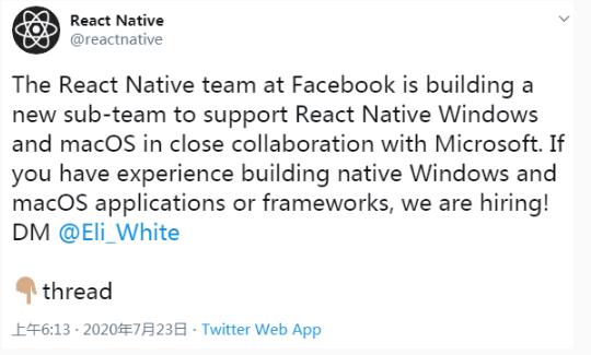 昨日,F(xiàn)acebook 宣布與微軟達(dá)成了更進(jìn)一步的合作,通過創(chuàng)建一個新的子團(tuán)隊,來改善 Windows 和 macOS 上的 React Native 體驗。