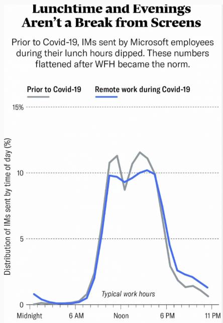 在家工作意味著經(jīng)理們與員工之間的交流越來越多。他們發(fā)送的即時消息增加了 115%,相比之下,針對個人的電子郵件則多發(fā)了 50%。此外,下午的會議已經(jīng)取代了早上的會議,午餐時間的即時消息減少了 10%,而在疫情之前,午餐時間的即時消息占比 25%。隨著人們努力趕工,出現(xiàn)了一種新的 "夜班 "模式,下午 6 點到午夜之間發(fā)送的午即時消息量增加了 52%。研究還顯示,以前周末工作時間最少的人,其工作量是平時的三倍。