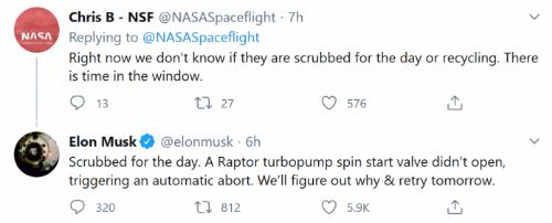 大約 45 分鐘后,馬斯克宣布嘗試失敗,并指出“Raptor 渦輪泵旋轉(zhuǎn)啟動閥未開啟導(dǎo)致發(fā)生中斷。”馬斯克同時放言:"我們會找出原因,明天再來!”