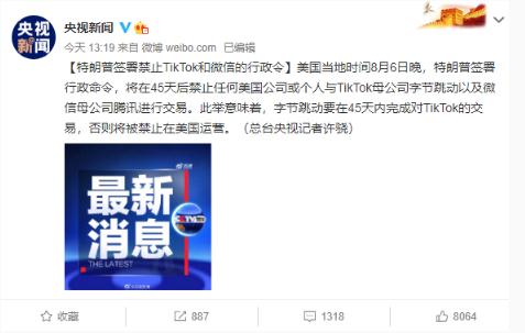 據(jù)央視報(bào)道,當(dāng)?shù)貢r(shí)間 8 月 6 日,美國(guó)宣布將在 45 天后禁止任何美國(guó)公司或個(gè)人與 TikTok 母公司字節(jié)跳動(dòng)以及微信母公司騰訊進(jìn)行交易。