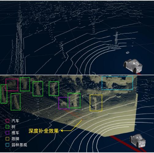 △上圖為低線束 LiDAR 原始點(diǎn)云,下圖為經(jīng)達(dá)摩院算法深度補(bǔ)全后的點(diǎn)云,LiDAR 線束量提升了 3 倍以上,且自動(dòng)駕駛車輛更好辨別出了障礙物。