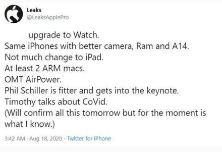 據(jù)知名爆料達(dá)人@LeaksApplePro 最新在 Twitter 上發(fā)布的消息顯示,全新的 iPhone 12 的相機(jī)將比以往更強(qiáng)大,同時(shí)還會(huì)增加運(yùn)存,且將全系搭載 A14 芯片,并且至少會(huì)發(fā)布兩款基于 ARM 的 Mac 產(chǎn)品,而此前被砍掉的無(wú)線充電板 AirPower 這次也將重新與大家見(jiàn)面。除此之外,此前還有消息稱全新的 AirPods Studio、HomePod Mini、AirTags 以及新款 Apple TV 都有可能隨之亮相。