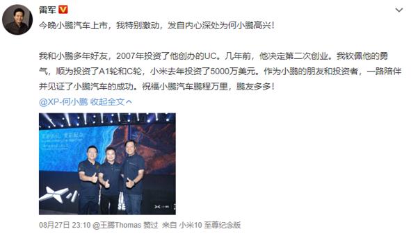 “作為小鵬的朋友和投資者,一路陪伴并見證了小鵬汽車的成功。祝福小鵬汽車鵬程萬里,鵬友多多!”雷軍說道。