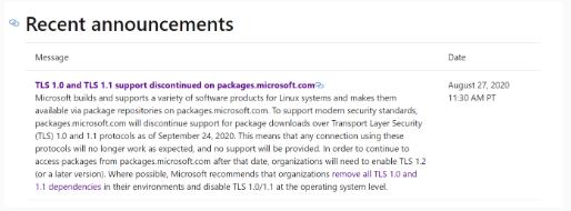 微軟為 Linux 系統(tǒng)構(gòu)建并支持各種軟件產(chǎn)品,并通過 packages.microsoft.com 上的軟件包存儲庫使它們可用。公告指出,“為了支持現(xiàn)代安全性標(biāo)準(zhǔn),自 2020 年 9 月 24 日起,packages.microsoft.com 將停止對通過傳輸層安全性(TLS)1.0 和 1.1 協(xié)議下載軟件包。”