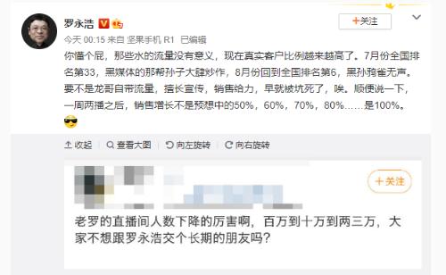 羅永浩表示,7 月份全國(guó)排名第 33,被大肆炒作,8 月份回到全國(guó)排名第6,結(jié)果黑粉就鴉雀無(wú)聲了。