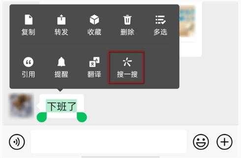 全量上線后,用戶可以在對話框中長按選擇文本,彈出的導航欄中的最后一個功能為“搜一搜”。