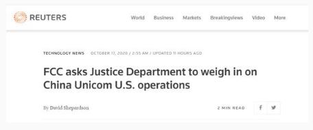 路透社:美國聯(lián)邦通信委員會要求美司法部介入中國聯(lián)通在美業(yè)務(wù)
