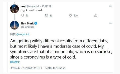 據(jù)環(huán)球網(wǎng)北京時(shí)間 11 月 16 日發(fā)布的消息,馬斯克15 日在推特上表示,自己可能是新冠肺炎輕中癥患者。他寫道,“我從不同的實(shí)驗(yàn)室得到了截然不同的結(jié)果,但最可能的是我是新冠肺炎輕中癥患者。我的癥狀是輕微感冒,這并不奇怪,因?yàn)樾鹿诓《臼歉忻暗囊环N。”