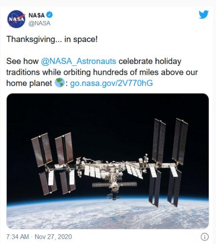 2020 年北美的感恩節(jié)對(duì)大多數(shù)人來(lái)說(shuō),就像今年大部分時(shí)間一樣,是一個(gè)混亂的節(jié)日。許多人因?yàn)樯缃痪嚯x的問(wèn)題無(wú)法探望家人。國(guó)際空間站上的宇航員與他們的家人的社交距離這樣一來(lái)就跟地球上的普通人差不多,但他們?nèi)匀挥米约旱姆绞綉c祝感恩節(jié)。美國(guó)宇航局的宇航員凱特·魯賓斯最近就發(fā)文提到當(dāng)國(guó)際空間站以每小時(shí) 17500 英里的速度環(huán)繞地球運(yùn)行時(shí),宇航員們?cè)趪?guó)際空間站上做了什么。