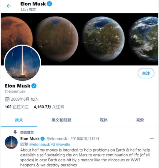 在馬斯克的個人推特上,他置頂了一條 2018 年發(fā)布的推文,對自己的個人財富做了大致的一個分配:一半用于地球,一半用于火星。