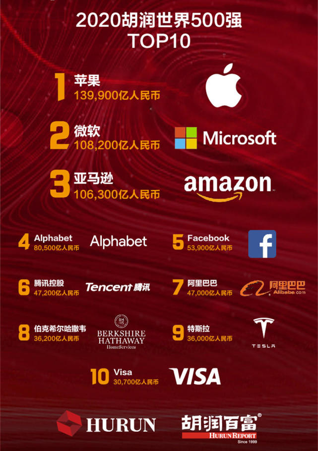 1 月 12 日消息,2020 胡潤(rùn)世界 500 強(qiáng)榜單于今日發(fā)布。蘋果公司以 14 萬億人民幣價(jià)值成為世界上最值錢的企業(yè);其次是微軟和亞馬遜,價(jià)值均超過 10 萬億元。Alphabet 排名第四,價(jià)值 8 萬億元。世界上四家價(jià)值上萬億美元的公司一年內(nèi)增加了 17 萬億元,相當(dāng)于印度 GDP,總價(jià)值達(dá)到 44 萬億元,占“胡潤(rùn)世界 500 強(qiáng)”的 13%。