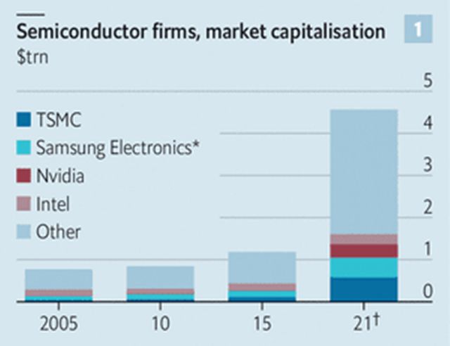 圖 1 膨脹的全球半導(dǎo)體產(chǎn)業(yè)市值。截圖自《經(jīng)濟(jì)學(xué)人》,數(shù)據(jù)來源:彭博社;麥肯錫咨詢公司;經(jīng)濟(jì)學(xué)人(下同)