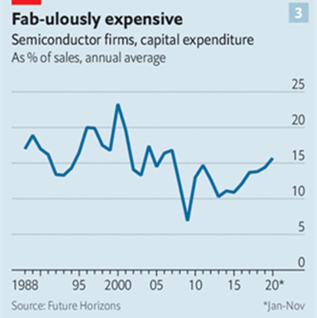 圖 3 芯片行業(yè)資本支出在下降過后,再度開始回升。截圖自《經(jīng)濟(jì)學(xué)人》數(shù)據(jù)來源:Future Horizons