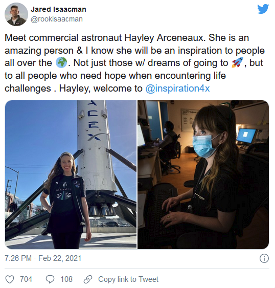 SpaceX 公司現(xiàn)在正在從事載人飛往太空的業(yè)務(wù),如果一切都按計(jì)劃進(jìn)行,它將在今年晚些時(shí)候率先為完全由私人太空游客組成的乘員提供一次太空旅行的機(jī)會(huì)?,F(xiàn)在,我們知道誰將加入億萬富翁、Shift4Payments 創(chuàng)始人 Jason Isaacman 曼的那趟旅行 - 圣裘德兒童研究醫(yī)院的員工,也是前病人 Hayley Arceneaux。