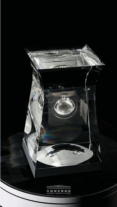下部地球造型磨砂透光,其上中國地圖造型透光突出,象征華夏大地對月亮的長久情意。特別是容器內設計了地球與月球間相隔 9.9cm,取意古人所描繪的“天有九霄”,寓意中國探月突破極限、跨越“九重”,珍貴的月壤與精心設計的容器相得益彰。