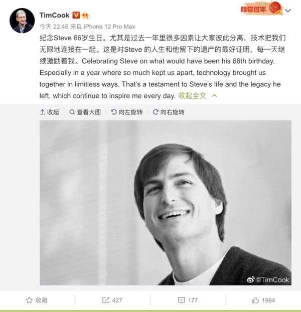 事實上,喬布斯離世后,蒂姆·庫克每年都會在 2 月 24 日發(fā)文紀念,今年自然也不例外。庫克表示,過去一年里很多因素讓大家彼此分離,而技術(shù)把我們無限地連接在一起。這是對 Steve 的人生和他留下的遺產(chǎn)的最好證明,每一天繼續(xù)激勵著我。