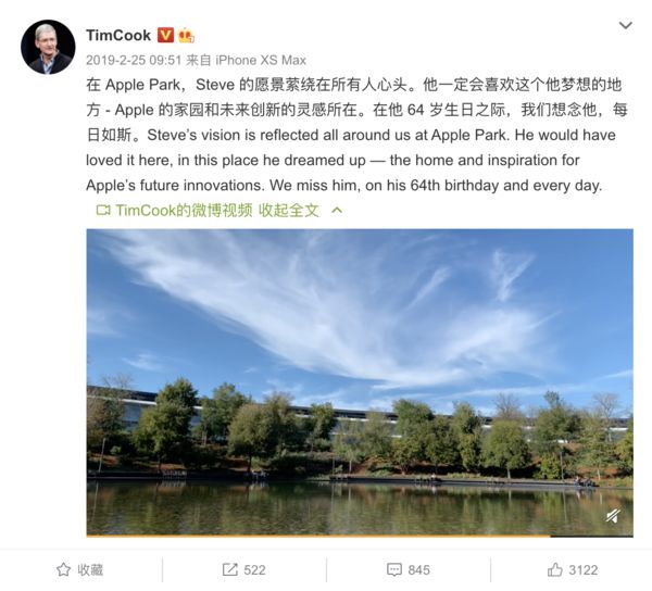 早在 2019 年,庫克就曾在社交媒體表示,在 Apple Park,Steve 的愿景縈繞在所有人心頭。他一定會喜歡這個他夢想的地方——Apple 的家園和未來創(chuàng)新的靈感所在。在他 64 歲生日之際,我們想念他,每日如斯。