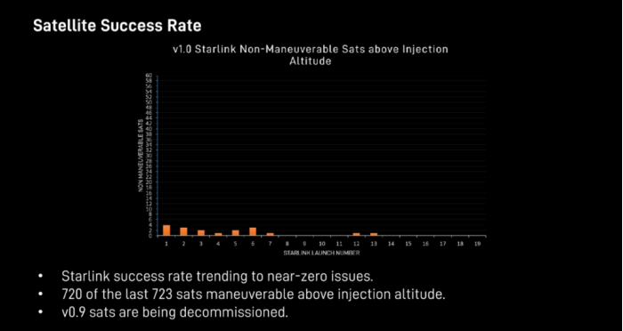 在安全方面,SpaceX 已經(jīng)進(jìn)行了兩項(xiàng)糾正性修改,以改善衛(wèi)星的非機(jī)動性。其中第一項(xiàng)是改進(jìn)其制造工藝,以便更好地進(jìn)行衛(wèi)星測試。第二個是軟件更新,旨在根除導(dǎo)致航天器停止響應(yīng)的問題。根據(jù) Goldman 的說法,這些變化已經(jīng)開始取得成效,因?yàn)樵?SpaceX 公司發(fā)射的最后 723 顆衛(wèi)星中,有 720 顆衛(wèi)星的機(jī)動性超過了注入高度。相對于直接將衛(wèi)星發(fā)射到其軌道高度,SpaceX 首先將衛(wèi)星送至較低的注入高度,之后測試其可操作性和反應(yīng),然后將衛(wèi)星升至其軌道目的地。