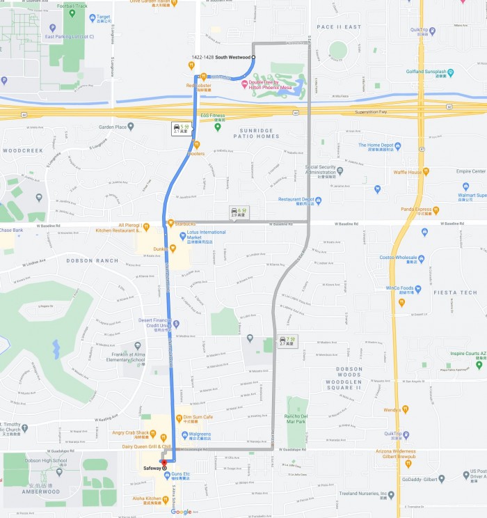 時(shí)間上有差別的原因是因?yàn)閮烧哌x擇了不同路線,Waymo One 并未依照一般 google 地圖所提供的最短導(dǎo)航路線來走而是選擇繞路走比較長的距離。有一種說法是 Waymo 采用的是比較安全的走法,也就是盡量不左轉(zhuǎn)而是多采用右轉(zhuǎn),雖然會(huì)繞一點(diǎn)路但是右轉(zhuǎn)通常來說比起左轉(zhuǎn)要安全很多,底下這張圖是 Waymo One 所選擇的路線: