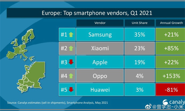 IT之家 5 月 6 日消息 今日早間,小米集團(tuán)副總裁、手機(jī)部總裁曾學(xué)忠發(fā)布微博表示,第一季度歐洲智能手機(jī)市場份額小米超過蘋果,首次達(dá)到第二;西歐智能手機(jī)出貨量增速迅猛,市場份額穩(wěn)居第三;西班牙智能手機(jī)市場份額連續(xù)五個(gè)季度穩(wěn)居第一。