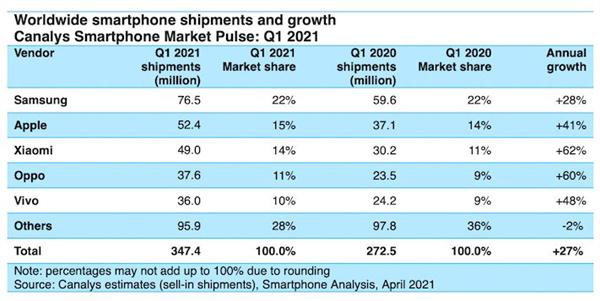IT之家了解到,上述數(shù)據(jù)來自調(diào)研機(jī)構(gòu) Canalys,該機(jī)構(gòu)的數(shù)據(jù)還顯示,2021 年第一季度全球智能手機(jī)出貨量呈上升趨勢,2021 年第一季度,全球智能手機(jī)出貨量達(dá)到 3.47 億部,同比增長 27%。