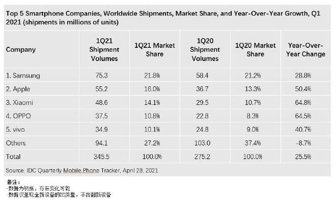 與此同時,IDC和Canalys等第三方機構也發(fā)布了2021年第一季度數據。數據顯示,2021年第一季度華為跌出了全球排名前五的位置,前五名分別是三星、蘋果、小米、OPPO和vivo。