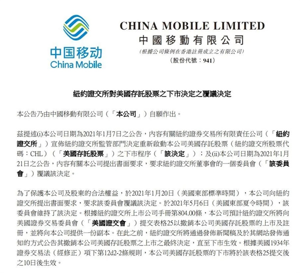 5月7日晚間,三大運(yùn)營(yíng)商紛紛公告,紐約證交所委員會(huì)維持了紐約證交所監(jiān)管部門重新啟動(dòng)本公司美國(guó)存托證券ADR下市程序的決定,預(yù)計(jì)紐約證交所將向美國(guó)證券交易委員會(huì)提交25表格以撤銷本公司美國(guó)存托證券的上市及注冊(cè)(退市)。