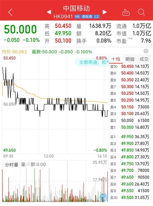 目前中國(guó)移動(dòng)的市值為1.02萬(wàn)億港元。
