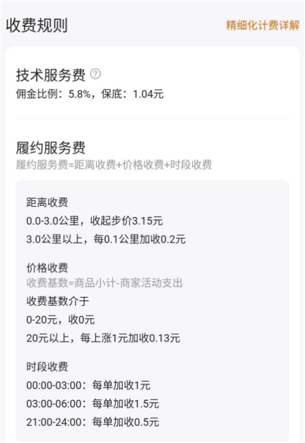 前幾天美團(tuán)把對(duì)商戶(hù)的費(fèi)率進(jìn)行了更改,把原來(lái)的固定的傭金拆分為較低的技術(shù)服務(wù)費(fèi)和履約服務(wù)費(fèi)。對(duì)于3公里以上的訂單和深夜凌晨等特殊時(shí)段,又采用了階梯式收費(fèi)。
