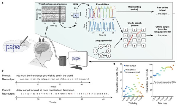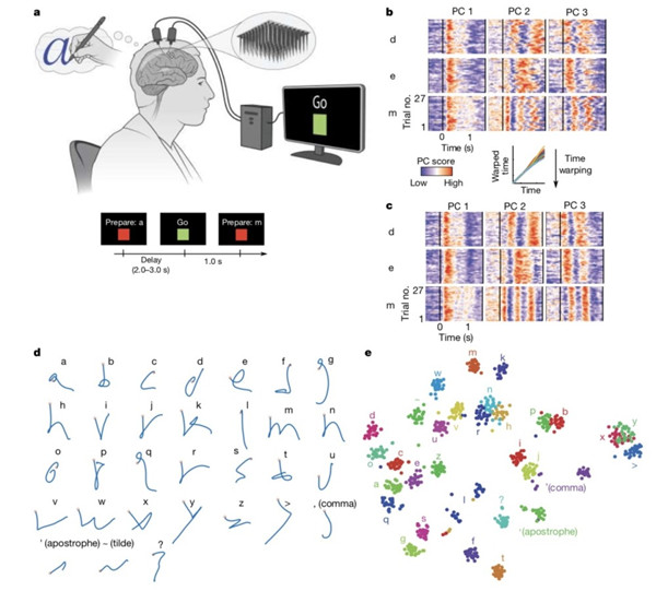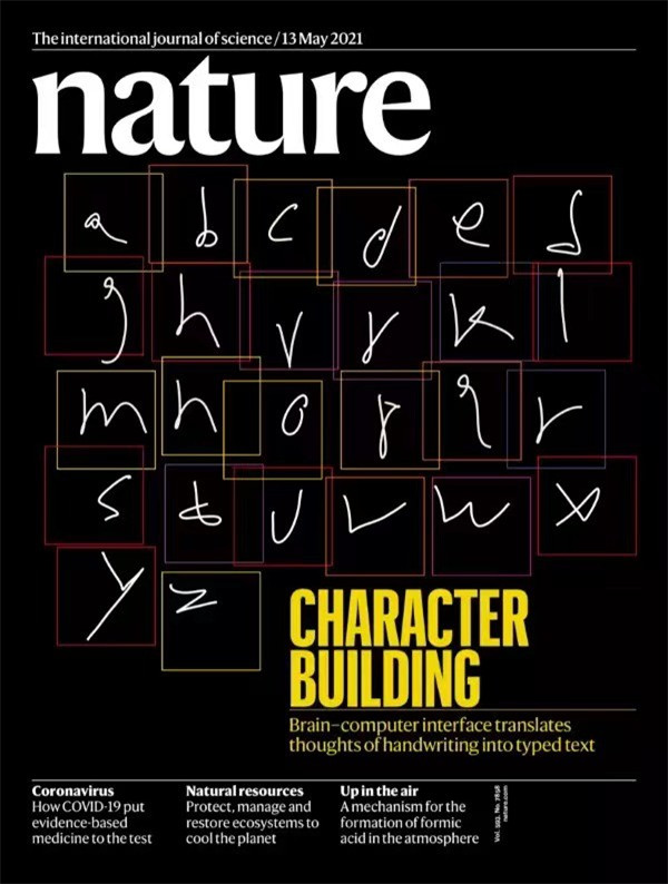 北京時間5月12日晚間,頂級學(xué)術(shù)期刊《自然》(Nature)以封面文章的形式刊發(fā)了由斯坦福大學(xué)、布朗大學(xué)、哈佛醫(yī)學(xué)院等團(tuán)隊的研究人員聯(lián)合完成的一項里程碑式研究,題為“High-performance brain-to-text communication via handwriting”。該研究回歸到古老的表達(dá)自方式——手寫,首次解碼了與書寫有關(guān)的神經(jīng)信號,并實時顯示它們。