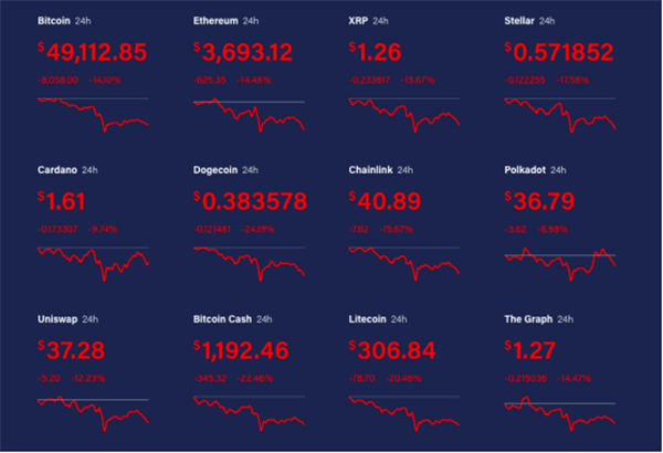 彼時(shí)比特幣閃崩也帶動(dòng)加密貨幣集體大跌。在比特幣跌破5萬美元關(guān)口時(shí),瑞波幣跌幅逾15%,以太坊跌超9%至2253美元附近。在比特幣日內(nèi)暴跌15%時(shí),以太坊暴跌20%,幣安幣暴跌17%,瑞波幣暴跌26%,狗狗幣暴跌19%,萊特幣暴跌28%。