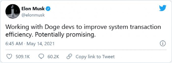 宣布特斯拉暫停比特幣支付后不久,馬斯克稱正在與狗狗幣開發(fā)人員合作以“提高系統(tǒng)交易效率”,并很有希望。