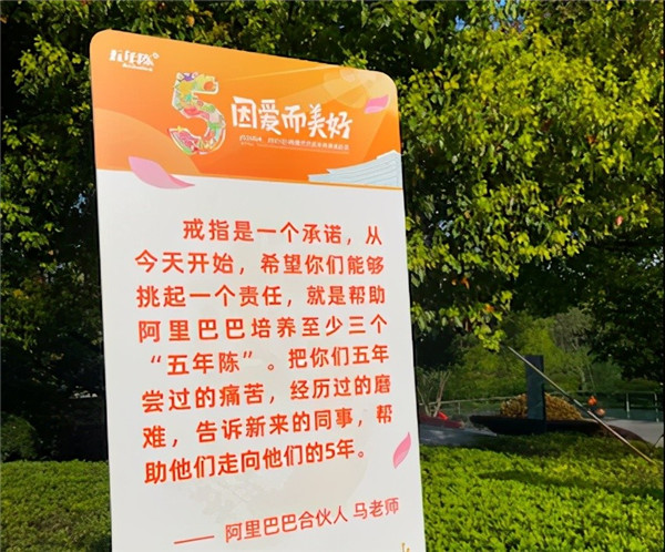 在阿里巴巴園區(qū),阿里巴巴合伙人馬老師的一段祝福被放在顯眼位置,“戒指是一個(gè)承諾,從今天開始,希望你們能夠挑起一個(gè)責(zé)任,就是幫助阿里巴巴培養(yǎng)至少三個(gè)五年陳。把你們五年嘗過的痛苦,經(jīng)歷過的磨難,告訴新來的同事,幫助他們走向他們的5年。”