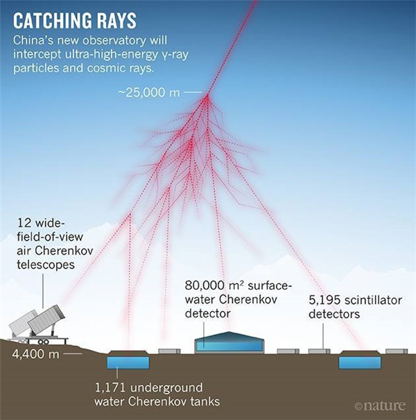 圖注:高能粒子產(chǎn)生大氣簇射,LHAASO各探測器對簇射的觀測(示意圖)來源:《自然》雜志。